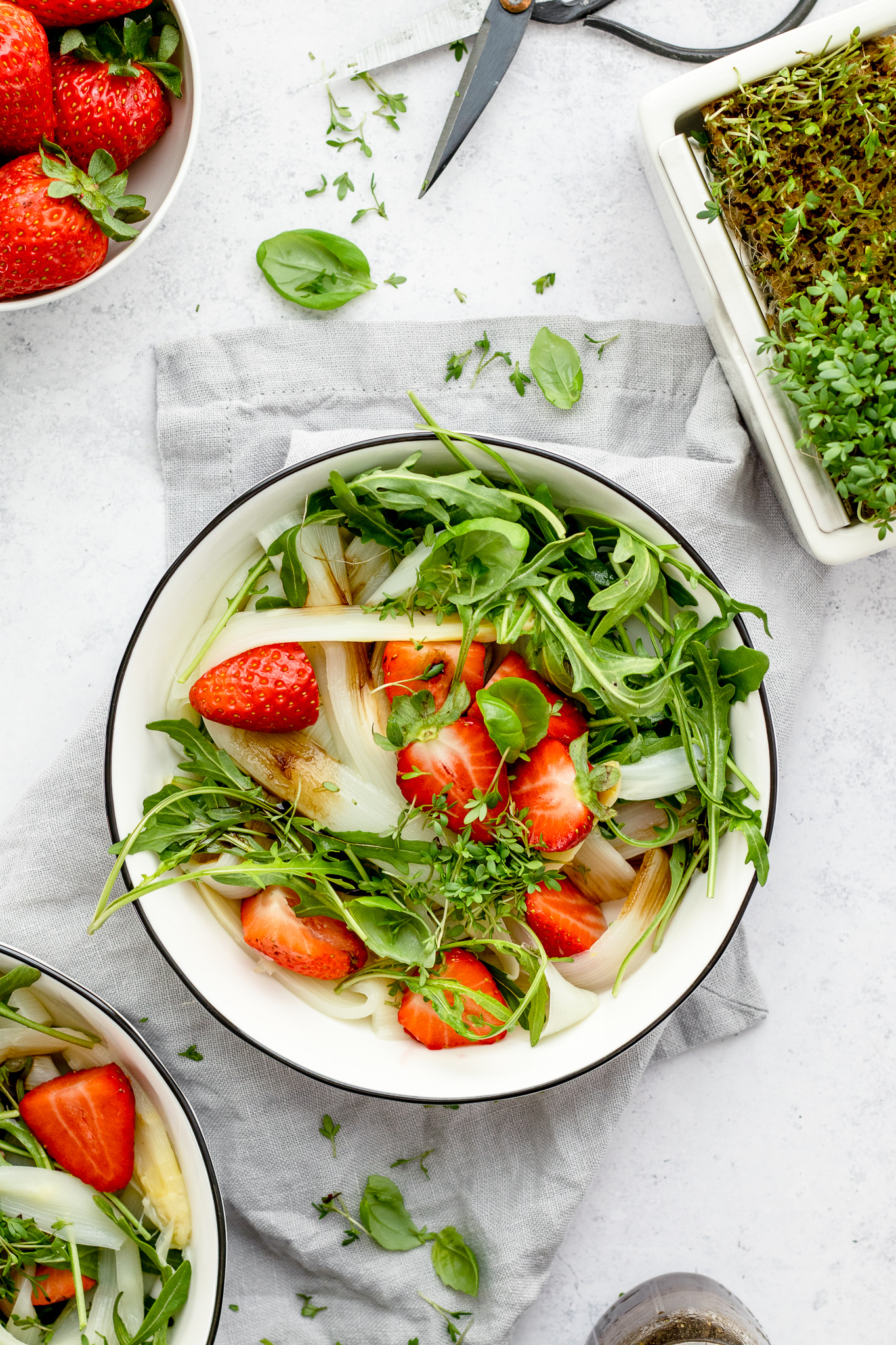 Rucola, Basilikum, Spargel und Erdbeeren in eine Schüssel geben und das Dressing darüber gießen. Mit Microgreens, Salz und Pfeffer toppen und servieren.